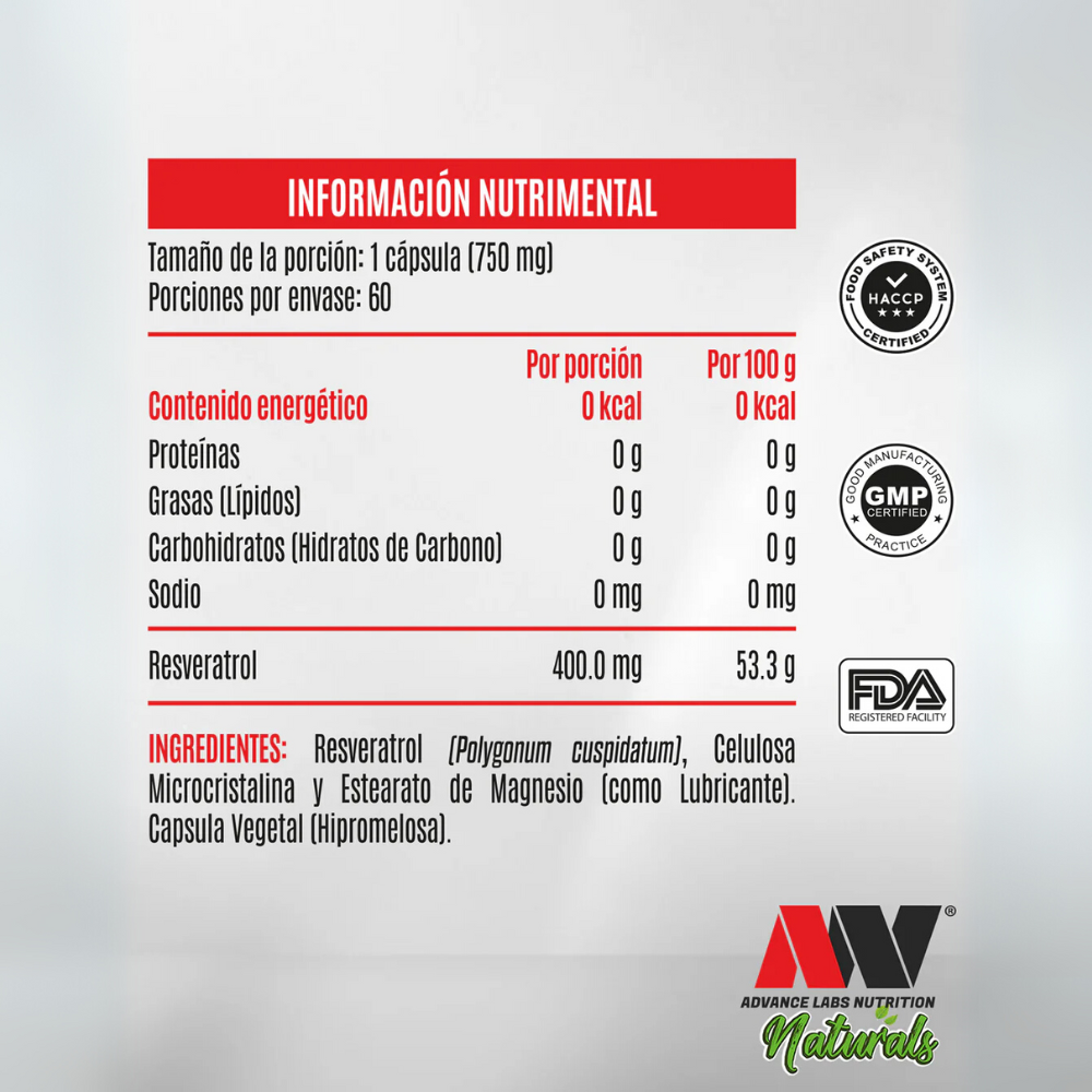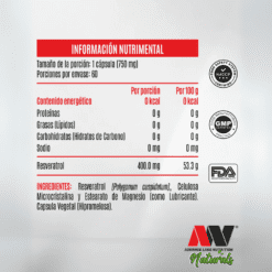 - Resveratrol de Alta Potencia: Cada cápsula contiene 400 mg de resveratrol (proveniente de Polygonum cuspidatum), una dosis concentrada para máximos beneficios.