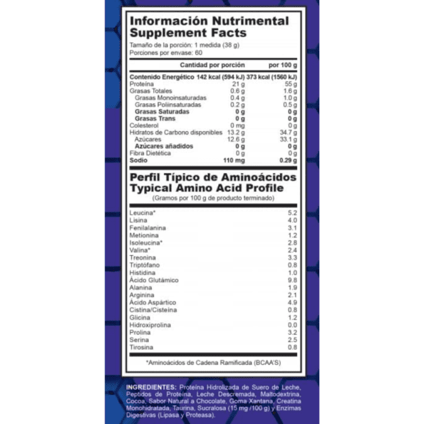 Las proteínas son esenciales para el cuerpo en el crecimiento y el mantenimiento de los tejidos del mismo, como los músculos, la piel, el pelo, las uñas, los órganos internos y hasta la sangre. La 100% Whey es una proteína hidrolizada de alto valor biológico, contiene proteína de suero con el más bajo contenido de grasa y carbohidratos. Hecha con materias primas americanas de la mejor calidad. Se le incorporó enzimas digestivas en su formulación la cual mejora aún más su absorción.