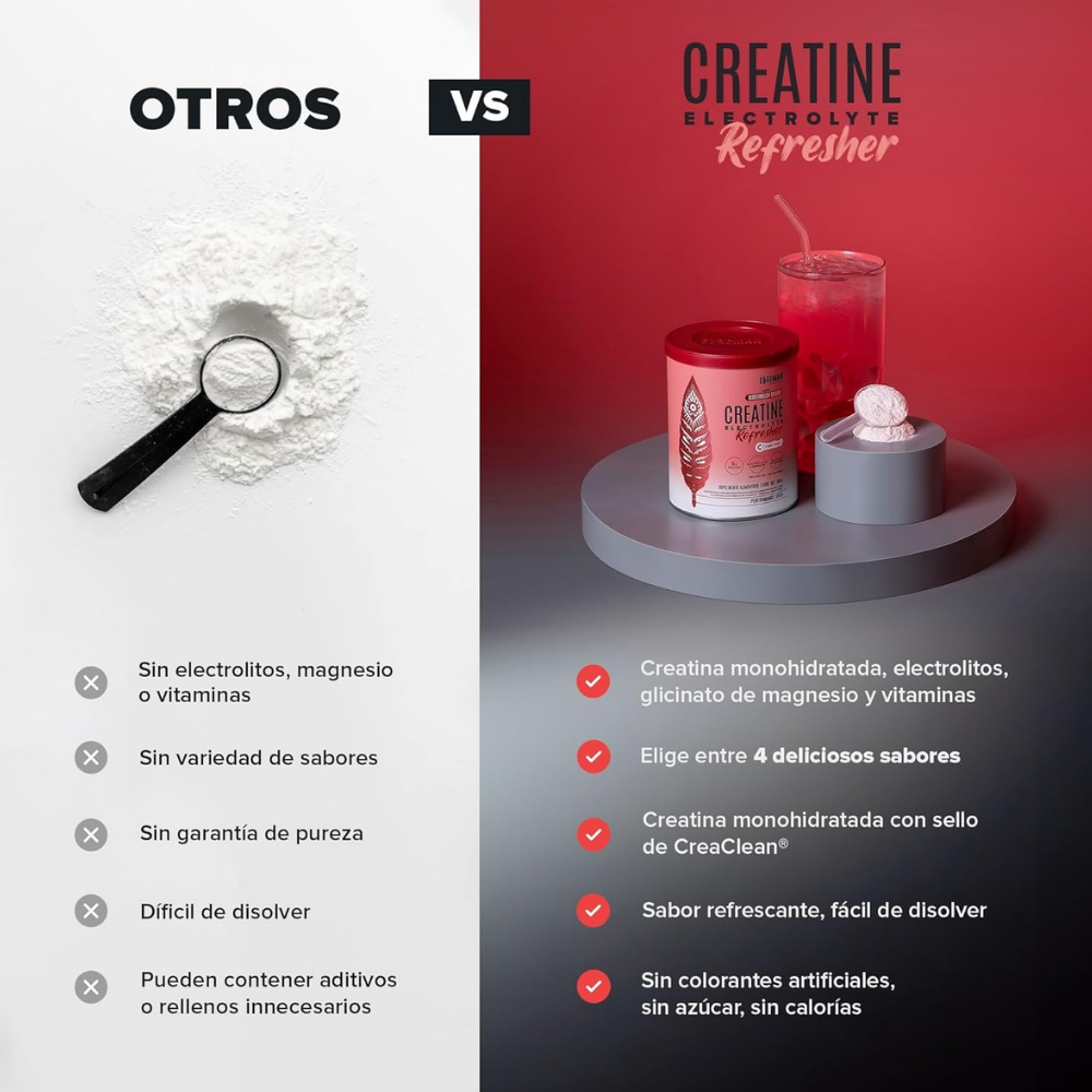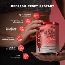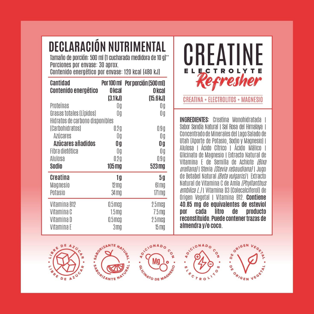 Creatine Electrolyte Refresher es la forma más refrescante y deliciosa de incorporar creatina a tu vida, combinando 5g de creatina monohidratada pura por porción con una mezcla exclusiva de electrolitos esenciales y glicinato de magnesio.