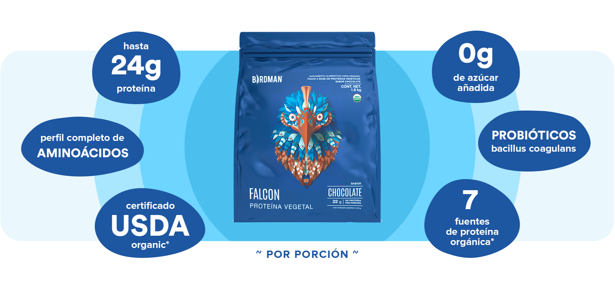 Falcon Protein está diseñada para apoyar tu ingesta de nutrientes diarios y está disponible en sabores orgánicos de chocolate, vainilla, chai, natural y fresa.