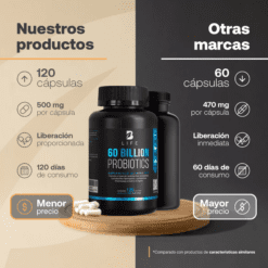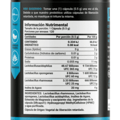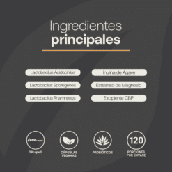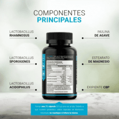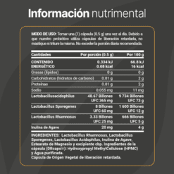 Cada cápsula de 500 mg está diseñada para aportar una increíble concentración de tres cepas de probióticos e Inulina de Agave, ingredientes valiosos para ti.