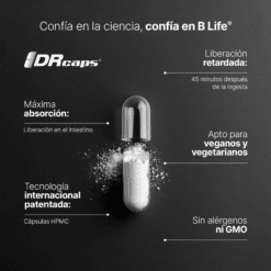 ¡Los probióticos que funcionan! 60 Billion Probiotics B Life®. Esta fórmula utiliza la innovadora tecnología DRcaps® para garantizar una absorción óptima gracias a su liberación retardada de 45 minutos después de la ingesta, maximizando sus beneficios en comparación con las fórmulas de liberación inmediata.