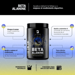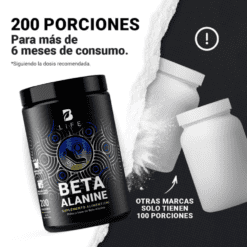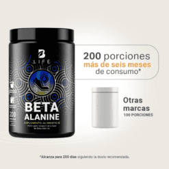 ¡Disfruta de la formulación de Beta Alanine de B Life®! Nuestra exclusiva composición ofrece una concentración de 2000 mg de Beta Alanina, un valioso aminoácido. Un solo frasco de 400 gramos te brindará un suministro de más de 6 meses de consumo, siguiendo la dosis sugerida de una medida (2g) al día, de acuerdo al modo de uso indicado.