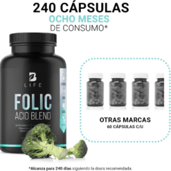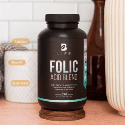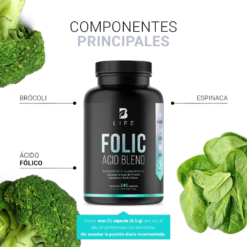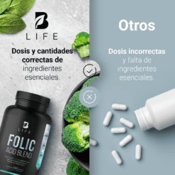 ¡Tu bienestar comienza con Folic Acid Blend B Life®! Cada cápsula de 500 mg contiene una increíble mezcla de Ácido Fólico, Brócoli y Espinaca. Ingredientes que actúan en sinergia, potenciando los beneficios únicos de esta fórmula, ausentes en otros productos.