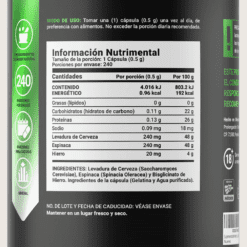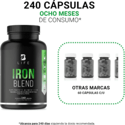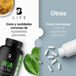 ¡Disfruta del alto valor proteico de Iron Blend B Life®! Experimenta con cada cápsula una potente concentración de 500 mg de una exclusiva combinación de Hierro, Levadura de Cerveza y Espinaca. Vitaminas y minerales esenciales para la absorción y utilización efectiva de las proteínas, ausentes en otras presentaciones.