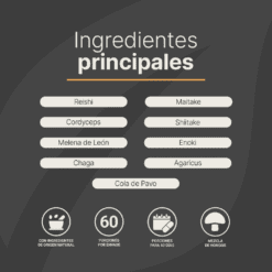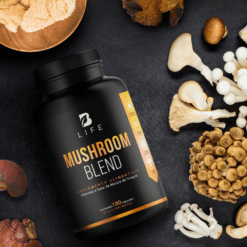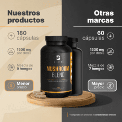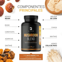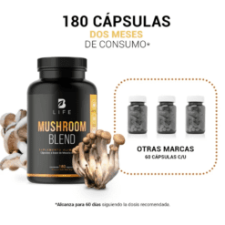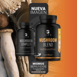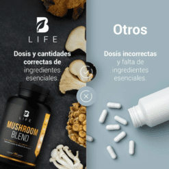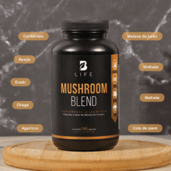 ¡Equilibra tu cuerpo y mente con Mushroom Blend B Life®! Cada cápsula de 500 mg contiene una potente concentración de una mezcla de Hongo Reishi, Cordyceps, Melena de León, Chaga, Cola de Pavo, Maitake, Shiitake, Enoki y Agaricus. Esta específica formulación de activos adaptógenos y antioxidantes no está disponible en otras presentaciones.
