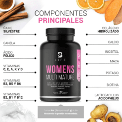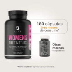 ¡Descubre el bienestar con Womens Mult Matur3 B Life®! Cada cápsula de 500 mg está diseñada a base de una increíble mezcla de Colágeno Hidrolizado, Calcio, Inositol, Maca, Potasio, Lactobacillus, Ñame Silvestre, Canela, Biotina, Ácido Fólico y un Complejo de Vitaminas esenciales para la mujer madura, formulación elaborada con ingredientes naturales, en comparación con otras que contienen componentes sintéticos.