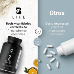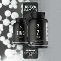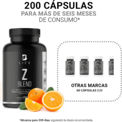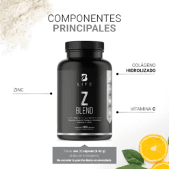 ¡Z Blend B Life®, protección y bienestar en cada porción! Cada cápsula de 420 mg ofrece una composición especial que combina Zinc, Vitamina C y Colágeno, una formulación única que integra minerales, vitaminas y proteínas esenciales para tu vitalidad.