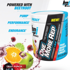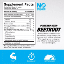 - Con una combinación única de potentes ingredientes que incluye remolacha, carnitina y citrulina, One More Rep™ brinda la fuerza y la resistencia que necesitas para hacer el ejercicio más duro y por más tiempo.