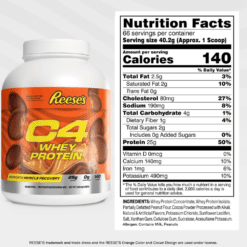 C4® Whey Protein ahora está disponible en tres sabores irresistibles: chocolate con leche de HERSHEY’S, mantequilla de maní y chocolate de REESE’S y vainilla. Cada porción contiene 25 g de proteína para favorecer el crecimiento y la recuperación muscular, todo ello sin añadir azúcar.