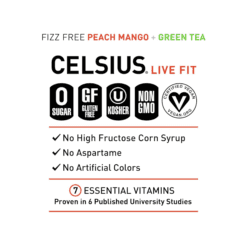 El té verde melocotón y mango es uno de los sabores sin gas de CELSIUS y es tan delicioso como parece. Elaborado con ingredientes clínicamente probados, este sabor de CELSIUS tiene el equilibrio perfecto entre sabor y energía que sirve como un excelente estimulante para estilos de vida activos.