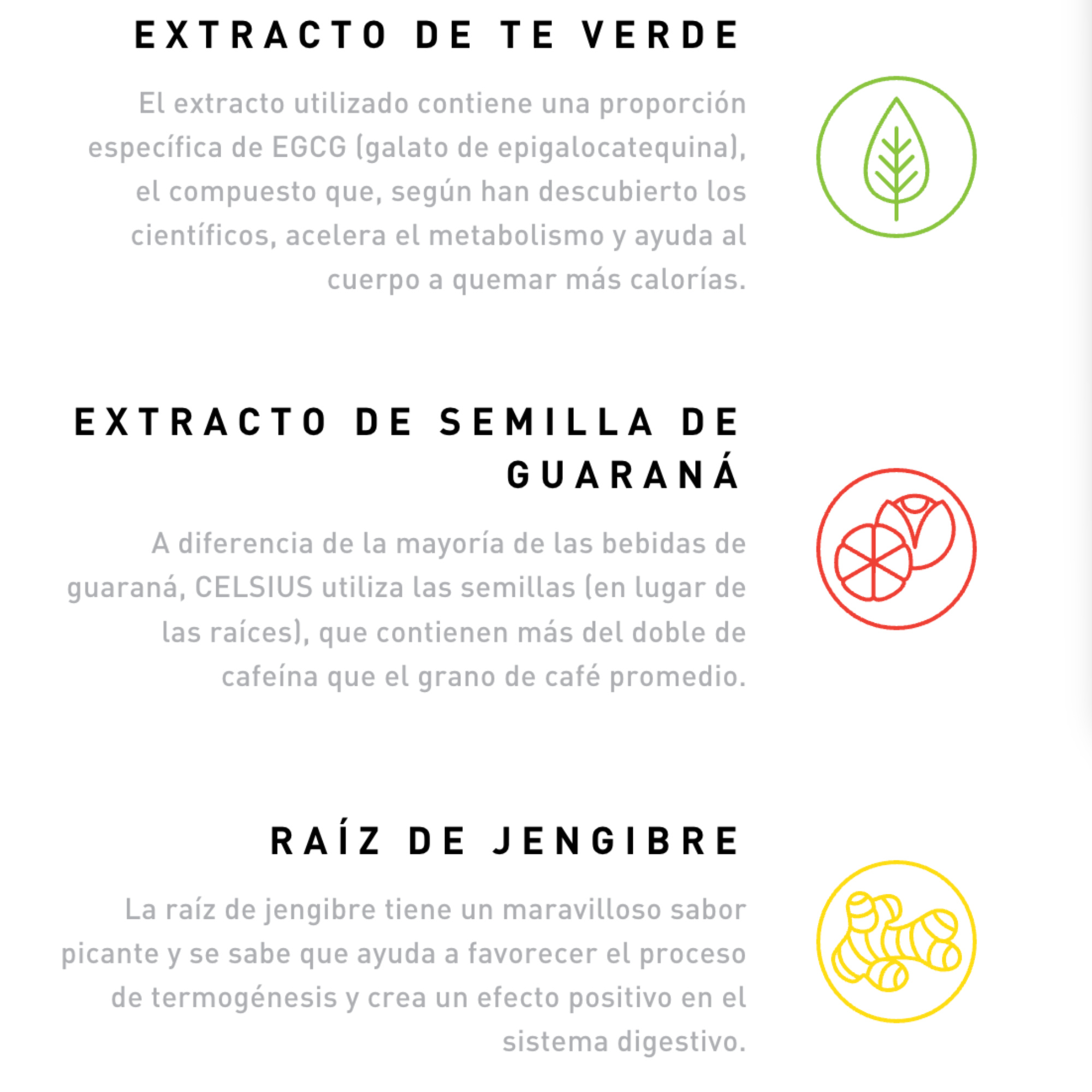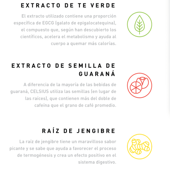 Nuestro objetivo es inspirar a aquellos que quieren vivir en forma dándoles una fuente de energía sostenida que está especialmente formulada para trabajar con tu cuerpo y ayudarte a alcanzar tus objetivos. Apoyamos a aquellos que trabajan horas extras en todo lo que hacen y nunca toman atajos. Podemos pasar el juego adicional, empujamos a través del último sprint y nos apresuramos a través del día de trabajo. CELSIUS destaca contra otras marcas porque está hecho con ingredientes más saludables como jengibre, guaraná, té verde y 7 vitaminas esenciales. Nuestras bebidas no contienen azúcar, aspartamo, jarabe de maíz con alto contenido de fructosa y no contienen conservantes, colores o sabores artificiales. CELSIUS está certificado sin gluten, kosher y sin OMG.