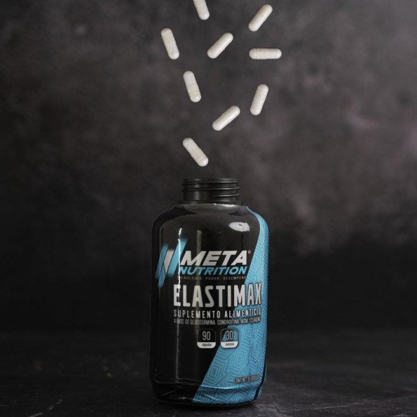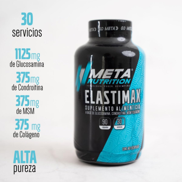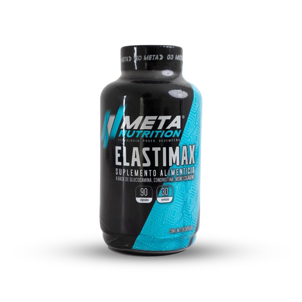 ELASTIMAX es la fórmula de Meta Nutrition diseñada especialmente para el cuidado y reparación de articulaciones y huesos. ELASTIMAX contiene por porción: -1500mg de Glucosamina la cual cuerpo utiliza para producir otras sustancias involucradas en la formación de tendones, ligamentos, cartílagos y líquido que rodea las articulaciones. -500mg de Condroitina que puede brindar al cartílago los elementos básicos que necesita para repararse y ayuda como lubricante de articulaciones. -500mg de MSM (Metil Sulfonil Metano) que puede ayudar a promover la cicatrización y regeneración de cartílago articular. -500mg de Colágeno la proteína que se encuentra en la piel, los ligamentos, los tendones, los huesos, los cartílagos, los vasos sanguíneos y otros tejidos conectivos.