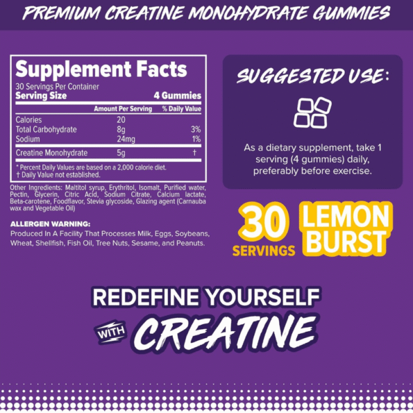 *Tenga en cuenta que, al contrario de lo que muestra la imagen del producto, las gomitas de creatina no tienen recubrimiento de azúcar.