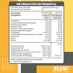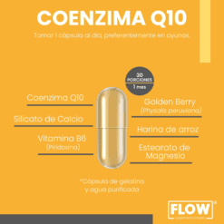 Coenzima Q10, Golden berries, Harina de arroz, Silicato de calcio, Vitamina B6, Estearato de magnesio. Cápsula de gelatina blanda. Es libre de aditivos y Gluten free.