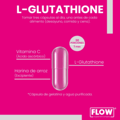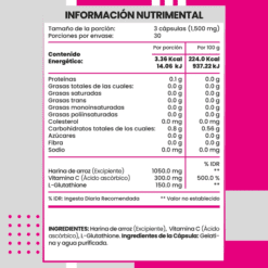 L-Gluthatione, Harina de arroz y Vitamina C. Cápsula: Gelatina y agua purificada.