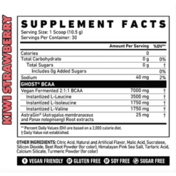 - BCAA 7G: GHOST BCAA ofrece un masivo 7G de BCAA fermentados veganos (3500 mg de leucina, 1750 mg de isoleucina y 1750 mg de valina) por cucharada.