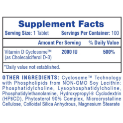 A medida que más y más personas encuentran formas de evitar el sol debido al aumento de las posibilidades de cáncer de piel, nuestros niveles generales de vitamina D3 son más bajos que nunca. La vitamina D3, también conocida como la “vitamina del sol”, se produce mediante nuestra interacción con el sol. Cuanto más horas de luz solar pasamos trabajando en espacios cerrados, en la escuela o en el interior debido al mal tiempo, nuestro cuerpo pierde la oportunidad de producir más de esta preciosa vitamina. Ahora, Hi-Tech Pharmaceuticals presenta una solución doble para el problema. Una, al proporcionar 2000 UI de vitamina D3 en cada porción y la otra, al encapsularla en el sistema patentado Cyclosome Delivery™.