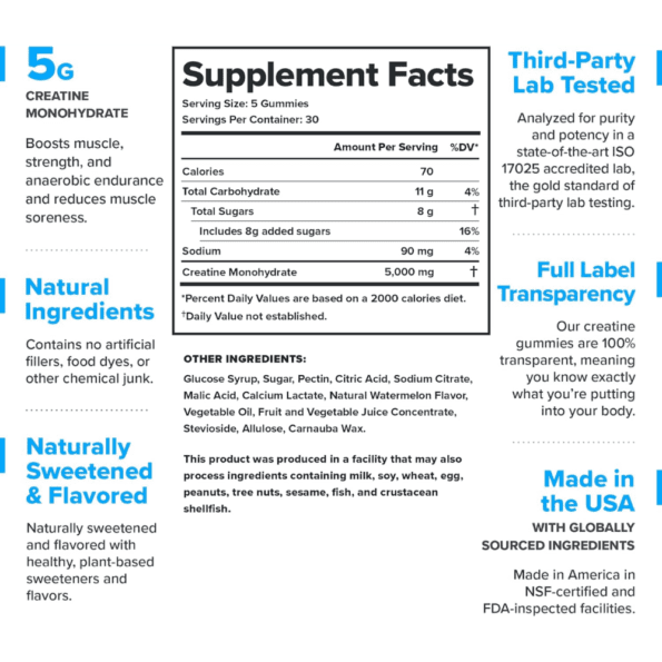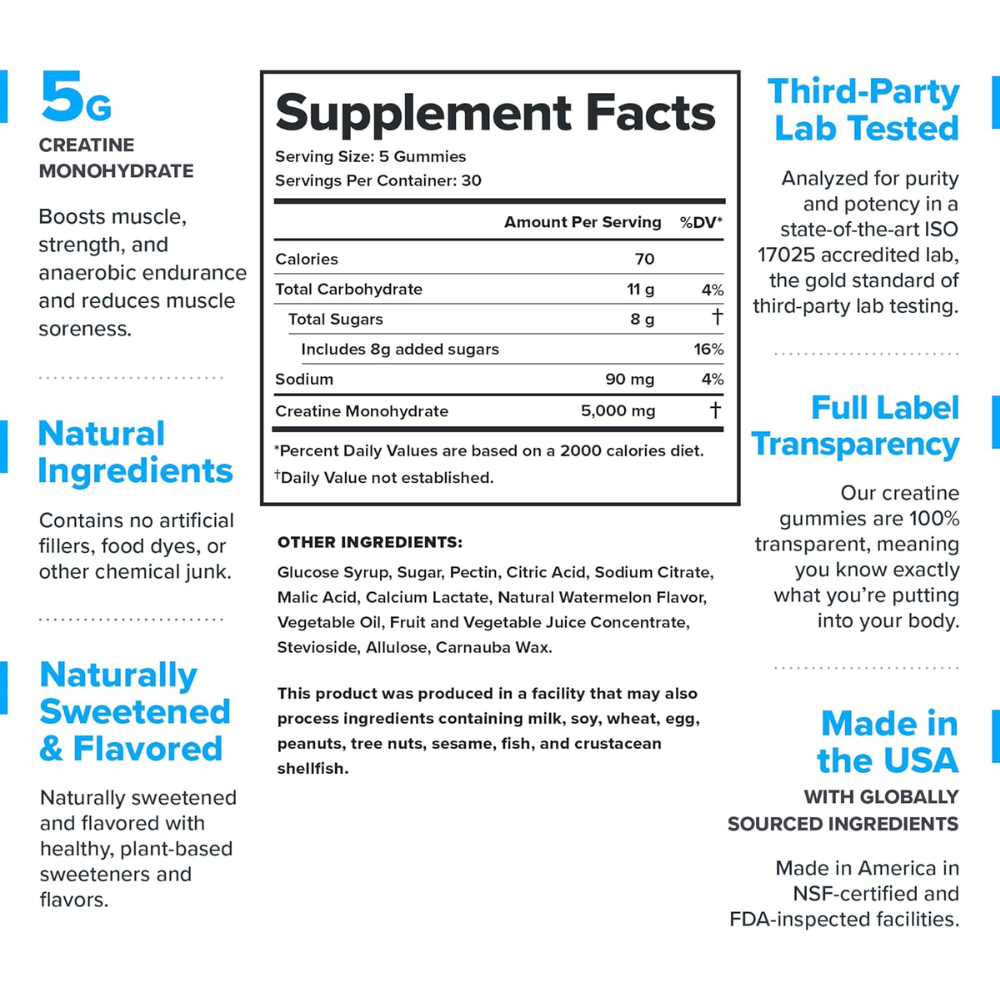 Obtenga nuestras gomitas de monohidrato de creatina naturalmente endulzadas y saborizadas con una dosis clínicamente efectiva de creatina que ha demostrado científicamente que aumenta la fuerza y la potencia, mejora el crecimiento muscular y mejora la recuperación.