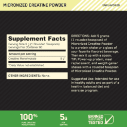 Lo mejor es que el MICRONIZED CREATINE POWDER se presenta en su forma micronizada, lo que facilita su mezcla y asimilación. Esta fórmula está sometida a pruebas anti-dopaje para garantizar su calidad. Experimenta el respaldo de la creatina monohidratada en su forma más pura, respaldando tu potencial de crecimiento muscular y tu rendimiento atlético de manera óptima.