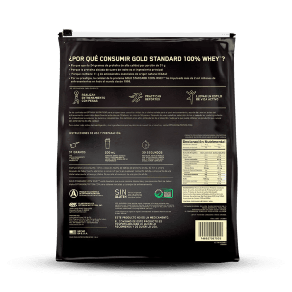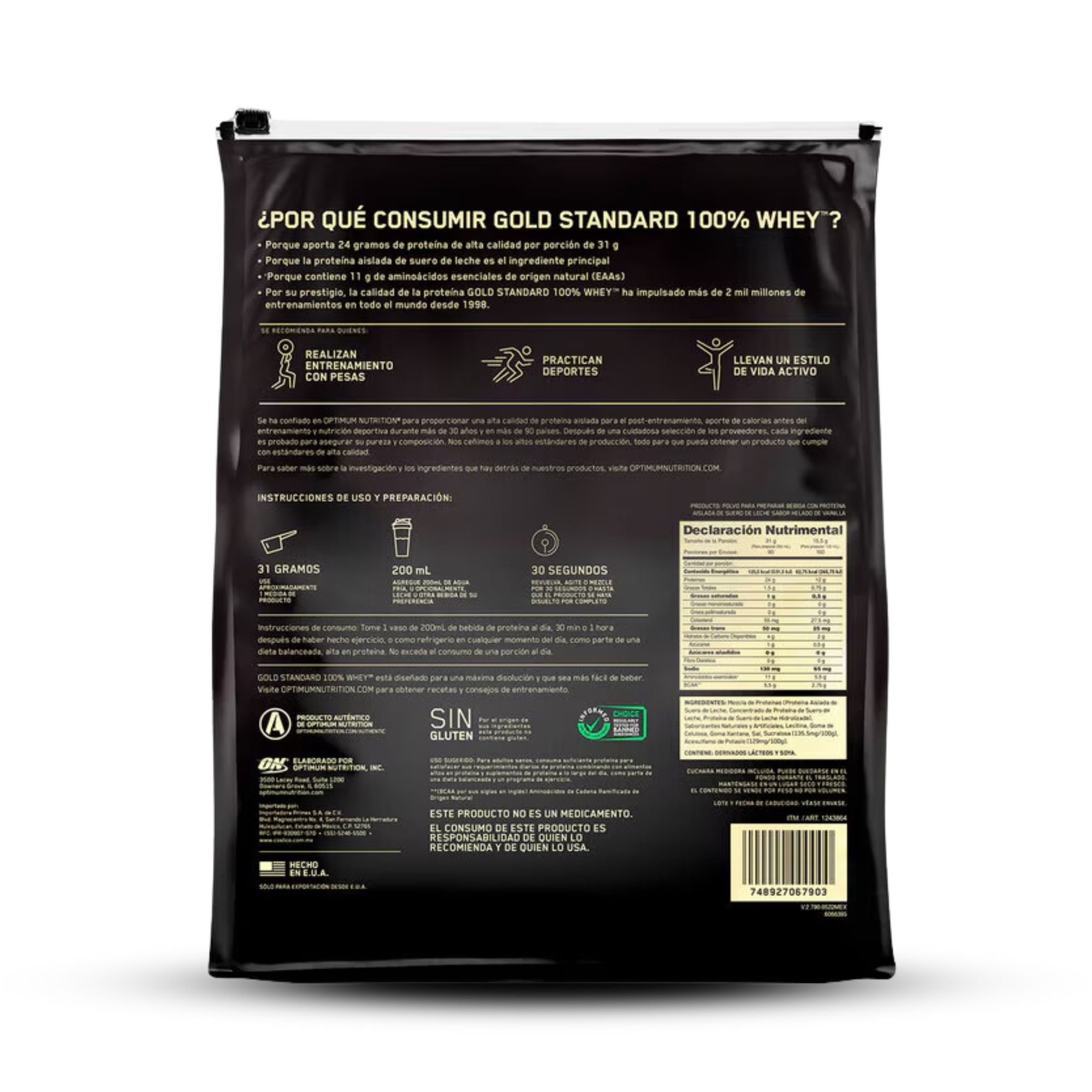 Gold Standard 100% Whey es una mezcla de proteínas de suero de leche que contiene aislado de proteína de suero WPI (Whey Protein Isolates), Concentrado de Proteína de Suero de Leche e Hidrolizado de Aislado de Suero. Esta mezcla de tres tipos de proteína, hacen de 100% Whey Gold Standard una de las formulaciones de proteína más puras, versátiles y preferidas por todo tipo de atleta en el mundo.