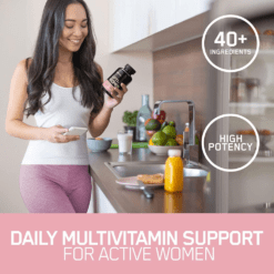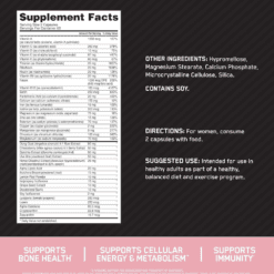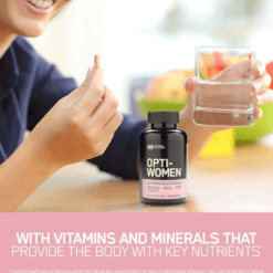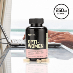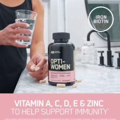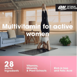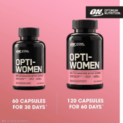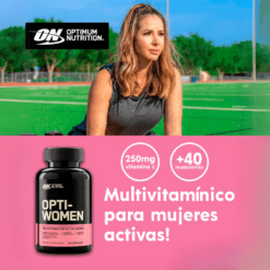 El sistema de optimización de nutrientes de ON para mujeres activas es un multivitamínico de alta potencia que contiene 40 ingredientes activos incluyendo bioflavonoides cítricos, isoflavonas de soja y otros ingredientes especiales. Cada porción de 2 cápsulas proporciona un soporte básico de micronutrientes que se puede construir a través del consumo de una dieta saludable y equilibrada. Piense en Opti-Women como un seguro nutricional para su estilo de vida en forma.