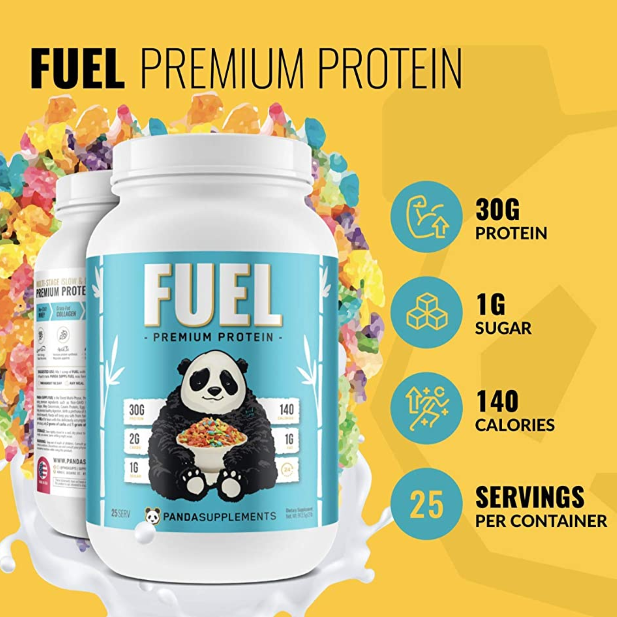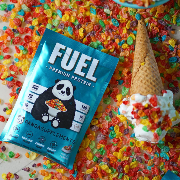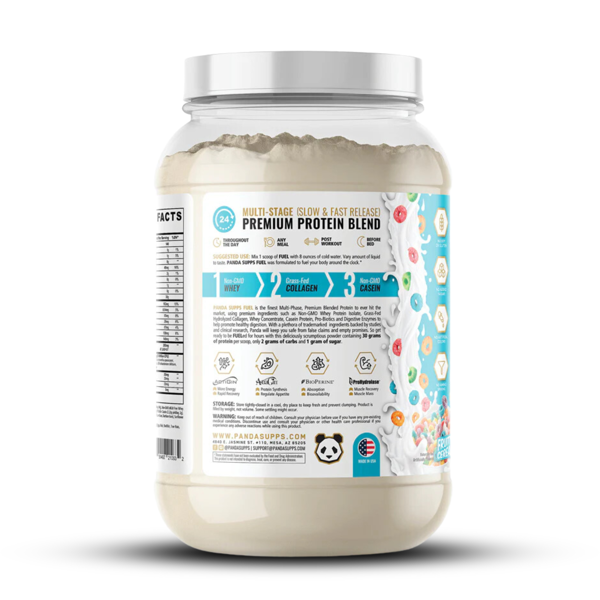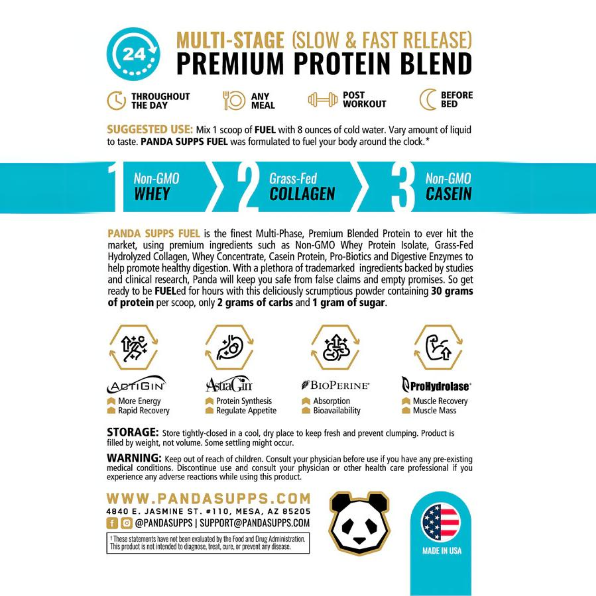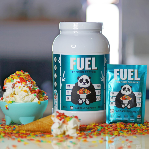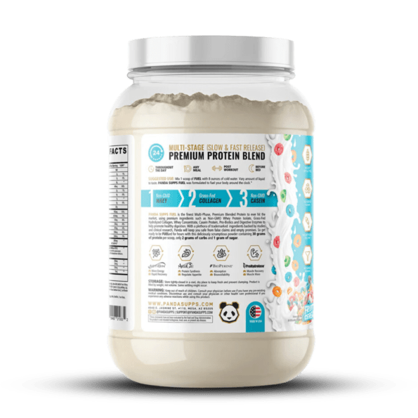 PANDA SUPPS FUEL es la mejor proteína multifase de primera calidad que ha llegado al mercado, y utiliza ingredientes de primera calidad como aislado de proteína de suero sin OGM, colágeno hidrolizado de animales alimentados con pasto, concentrado de suero, proteína de caseína, proteína de huevo, probióticos y enzimas digestivas para ayudar a promover una digestión saludable. Con una gran cantidad de ingredientes de marca registrada respaldados por estudios e investigaciones clínicas, Panda lo mantendrá a salvo de afirmaciones falsas y promesas vacías. Así que prepárese para estar alimentado durante horas con este delicioso y delicioso polvo que contiene 30 gramos de proteína por cucharada, solo 2 gramos de carbohidratos y 1 gramo de azúcar.