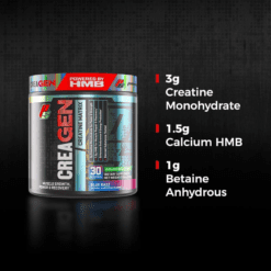 CreaGEN®️ es el único suplemento de fuerza y recuperación que combina el poder de la creatina con la betaína y el ácido β-hidroxi β-metilbutírico (HMB) para ayudarlo a llevar su entrenamiento al siguiente nivel. La creatina es el suplemento más estudiado en el mercado hoy en día y se ha demostrado que aumenta la fuerza y la masa muscular. La creatina y la betaína funcionan sinérgicamente para aumentar la creatina biodisponible, que respalda la energía celular, la fuerza y la producción de potencia durante el ejercicio de resistencia. ¡Obviamente, no podíamos detenernos allí! HMB, un metabolito del aminoácido leucina, mejora la recuperación al ayudar a prevenir la degradación muscular. CreaGEN® es el producto perfecto para cualquiera que busque un suplemento de creatina de calidad para ayudar a aumentar su rendimiento deportivo.