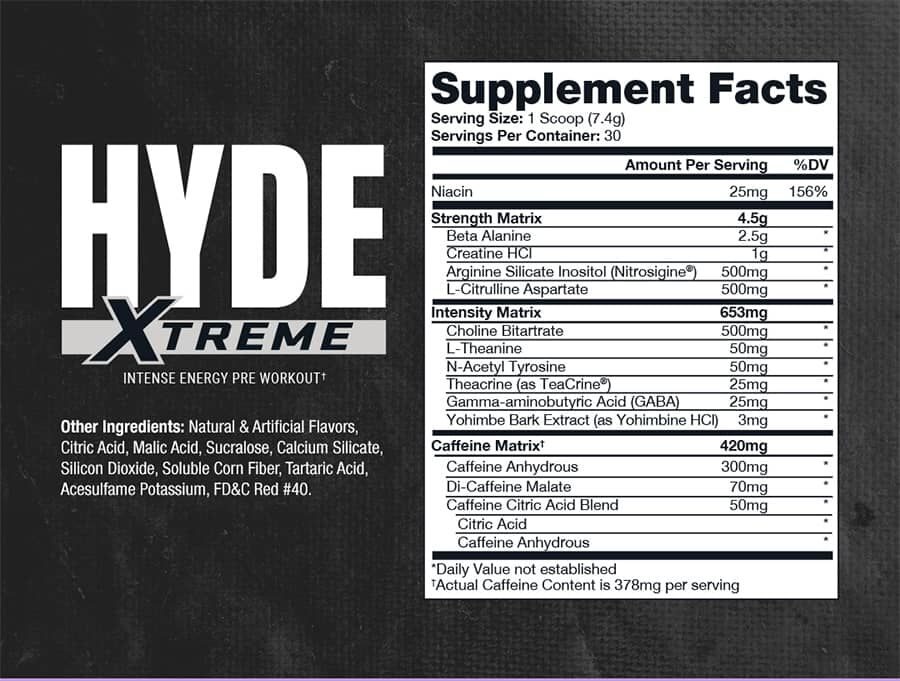 HYDE® Xtreme es tu solución pre-entrenamiento en polvo que potenciará incluso el entrenamiento más arduo. Nuestra fórmula única está cargada con Yohimbe y presenta una matriz de cafeína de 420 mg con TeaCrine® para un enfoque nítido como láser, y está además potenciada por Beta Alanina, Creatina, Citrulina y Nitrosigina®. Una cucharada de esta intensa fórmula previa al entrenamiento brinda energía extrema con mayor potencia, fuerza, resistencia y bombeos musculares. Es fácil ver por qué hombres y mujeres de todo el mundo han hecho de este el mejor pre-entrenamiento del mercado durante ocho años consecutivos. No te conformes con cualquier pre; ve a la segura con HYDE® Xtreme. †