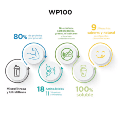 WP100 EVOLUTION es una proteína aislada de suero de leche microfiltrada y ultrafiltrada que le caerá bien a tu cuerpo por lo ligera que es, te ayudará a lograr tus metas y objetivos mientras disfrutas de sus 5 deliciosos sabores, además del natural.