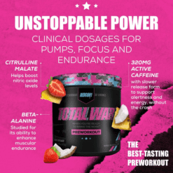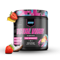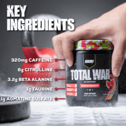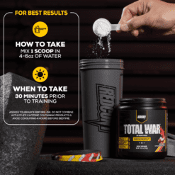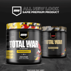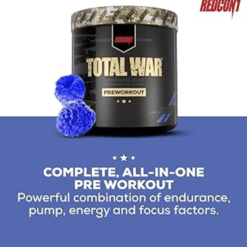 ¿Busca el suplemento preentrenamiento definitivo para llevar sus entrenamientos al siguiente nivel? ¡Experimenta la fórmula preentrenamiento número uno en ventas de REDCON1! TOTAL WAR es un polvo preentrenamiento todo en uno que incluye una poderosa combinación de factores de resistencia, bombeo, energía y concentración. Con 320 mg de cafeína, 3,2 g de beta alanina y 6 g de malato de citrulina en el núcleo de la fórmula, cada cucharada de TOTAL WAR está repleta de ingredientes clínicamente investigados en niveles eficaces para que puedas entrenar a un nivel de élite en todo momento.
