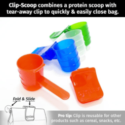 Presentamos el Clip-ScoopSin cremallera, teníamos que tener una forma diferente de cerrar nuestras bolsas de nuevo diseño. Siempre recurrimos a algún tipo de “clip para patatas fritas”, pero queríamos asegurarnos de que no fuera otro trozo de plástico que terminara en un vertedero una vez que se acabara la proteína. Así nació el Clip-Scoop, que combina una cuchara para proteínas con un clip desprendible que también se puede reutilizar para patatas fritas, cereales o cualquier otra cosa que guardes en bolsitas pequeñas. |