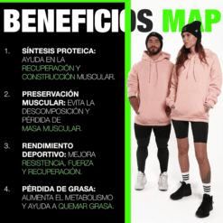 Además, MAP no tiene desechos metabólicos como la carne, pescado o batidos ni sodio, azúcar o grasas.